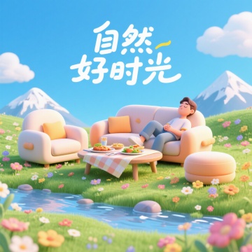 清新3D卡通拟人风,波普艺术花朵点缀,营造梦幻花海节日氛围。