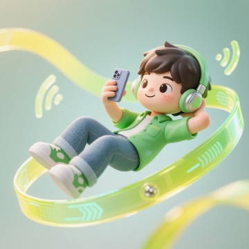 3D风卡通男孩悬浮于透明玻璃质感轨道,佩戴耳机畅享音乐,未来感科技线条环绕,塑料光泽与虚拟现实元素交织,清新绿调营造轻盈梦幻氛围。