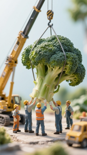 微缩艺术风,卡通小人合力搬运巨型西兰花,趣味感十足,创意独特。