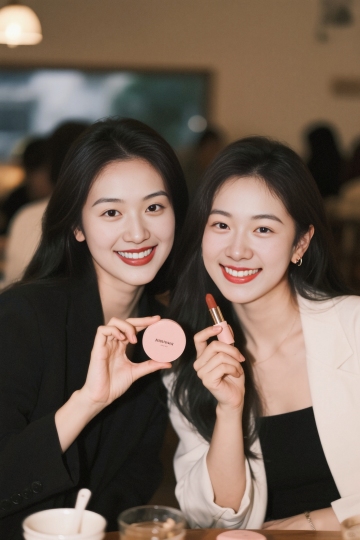 清新甜美,舒适实景,两人共饮,笑容温暖。