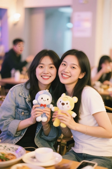 2个女生,拿着奶茶的合照影像,可爱风,时尚穿搭,休闲聚会场景,快乐氛围,光感柔和,生活记录感,享受时光