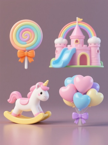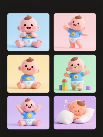 Q版可爱卡通风格儿童系列素材套系,4个不同场景,每个场景中都有一个Q版儿童坐在不同物品上。第一个场景:一个扎着双马尾的小女孩,穿着带有粉色花朵图案的白色连衣裙,蓝色袜子配红色小皮鞋,正开心地坐在黄色纸飞机上,右手举起食指指向天空,眼睛看向手指方向,表情天真可爱,整体呈现出圆润的3D立体效果,色彩明快柔和,边缘光滑无棱角,背景为纯白色。第二个场景:一个Q版儿童坐在一本打开的彩色书本上,书本有明显的书页层次感,儿童穿着与第一个场景风格统一的可爱服饰,表情愉悦,姿态自然。第三个场景:一个Q版儿童坐在弯弯的黄色月亮上,月亮表面有柔和的光泽感,儿童或躺或坐,姿态舒适惬意,服饰保持Q版可爱风格。第四个场景:一个Q版儿童坐在几级彩色的台阶上,台阶有立体感,儿童坐在台阶中间或最上层,表情活泼,整体风格与前三个场景统一,色彩搭配协调,所有场景均无LOGO、电话地址及二维码。