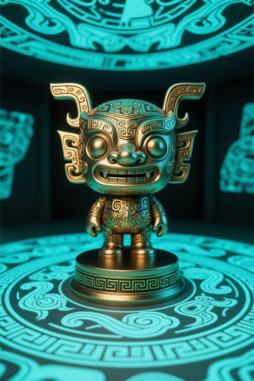 鎏金面具拟人化,3D立体呈现,古典神秘,国潮风设计,光影交错。
