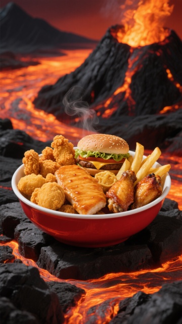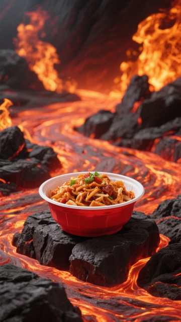 薯條包外壁上攀爬着微型探险者,熔岩顆粒背景