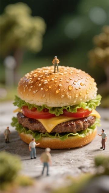 3D微缩艺术风,超现实主义设计,趣味清新感十足的巨型汉堡场景。