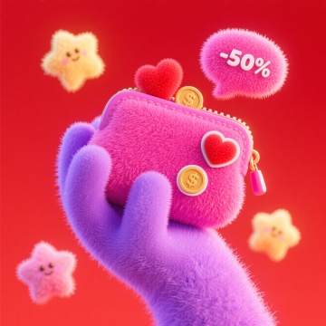 3D毛绒钱包溢出金币与优惠券,重拟物风搭配梦幻渐变色,营造甜蜜可爱促销氛围,节日感十足。