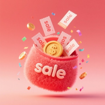 软3D风格粉色钱袋,溢出多彩折扣券,塑料质感搭配明亮色块,营造强烈促销氛围,适合节日营销视觉。