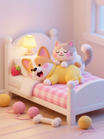3D卡通风格,可爱小狗与猫咪拟人化共眠,简约温馨,毛发生长细节生动。