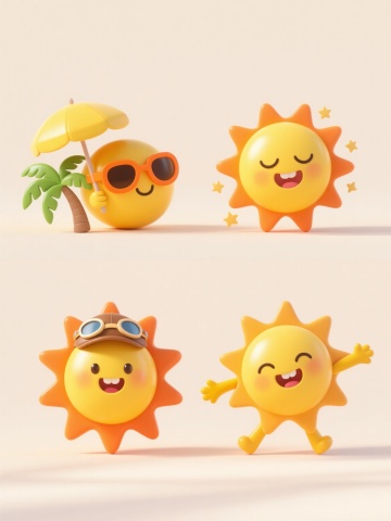 六个3D风格太阳图标,保持原图标黄色圆形主体、橙黄色放射状光芒和粉色腮红的配色方案,每个太阳拥有不同的样式设计,包括不同的表情(如微笑、眨眼、惊讶等)、光芒形状变化(如尖角形、圆形、火焰形等)和细节装饰(如戴小帽子、戴眼镜、带光晕等),整体采用圆润可爱的3D模型质感,具有平滑的渐变色彩过渡和柔和的高光阴影效果,六个太阳图标以整齐的两行三列网格形式排列在纯白色背景上。