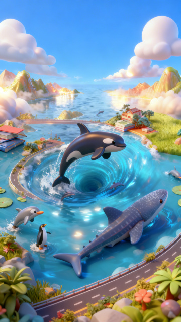 软3D风格的毛绒鲸鱼火车,拟人化设计萌趣十足,搭配针织质感车厢与雪景,营造梦幻温馨的冬日童话氛围。