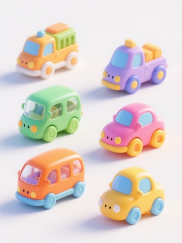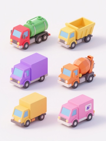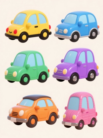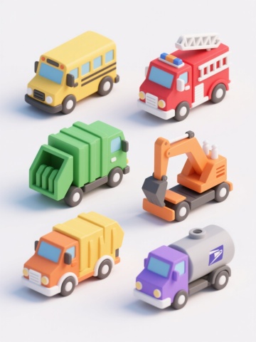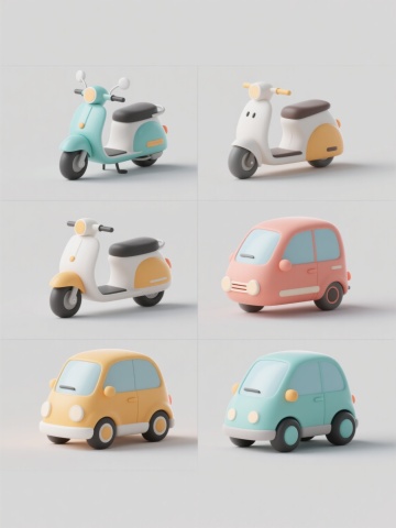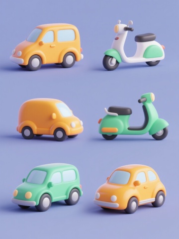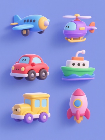 一套6个完全不同元素内容的旅游主题3D立体插画系列素材集合,每个元素均采用圆润可爱的卡通造型风格,明亮饱和的纯色配色方案,细腻的黏土质感表现,柔和均匀的漫反射光影效果,规整的构图布局,无任何文字、logo和水印。第一个元素:黄色卡通巴士停在绿色草坪上,车顶有橙色行李箱,旁边有蓝色自行车、橙色手提箱、粉色信封和蓝色飞机;第二个元素:红色卡通火车行驶在蓝色轨道上,车厢载有棕色登山包、黄色帐篷和绿色树木,旁边有白色指南针和紫色登山杖;第三个元素:蓝色卡通轮船漂浮在浅蓝色海面上,船上有黄色救生圈、橙色望远镜和绿色渔网,旁边有粉色海星和白色贝壳;第四个元素:绿色卡通热气球飞翔在橙色天空中,气球上有红色条纹,吊篮里有棕色野餐篮、黄色三明治和粉色饮料,旁边有白色云朵和蓝色小鸟;第五个元素:紫色卡通越野车行驶在棕色沙漠上,车顶有绿色行李架,旁边有黄色仙人掌、红色油桶和蓝色地图,地上有白色车辙印;第六个元素:橙色卡通自行车停在紫色花田中,车上有蓝色水壶、绿色背包和粉色花朵,旁边有黄色蝴蝶、白色蒲公英和棕色长椅。所有元素均以纯色为背景,整体色彩协调统一,保持相同的3D立体风格和旅游元素类目,呈规整排布。