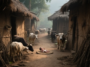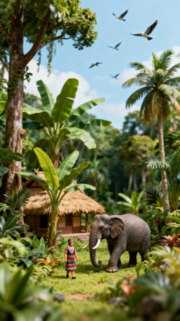 呈现出热带雨林场景的画面,充满自然与人文融合之美,茂密多样的植被是主体,高大乔木、芭蕉等阔叶植物交错,营造出浓郁雨林氛围,飞鸟点缀增添生机,展现生态的丰富与活力,传统茅草屋融入自然,体现当地建筑对环境的适应,身着民族服饰的人物、大象,传递出地域文化与人和自然的和谐共处