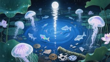 异常巨大的荷叶布满清晰脉络纹理,违反透视原理的失调比例构图,高饱和度色彩强烈碰撞,孤舟在夸张变形的荷叶丛中穿行,水彩渲染技法呈现密集拼贴效果,画面充满怪诞奇幻感生成一张水底仰视,水彩插画风格的图片,描绘一个宁静的水下世界。阳光透过水面,形成美丽的光斑和光点。画面中充满了水生植物,巨大的叶柄从水底伸出水面,几条小鱼在其中游动。整个场景色彩鲜艳,充满梦幻和神秘的氛围,展现了自然的美丽。
