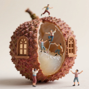 梦幻卡通风格,微缩艺术展现荔枝内部小世界,孩子们在果肉中嬉戏。