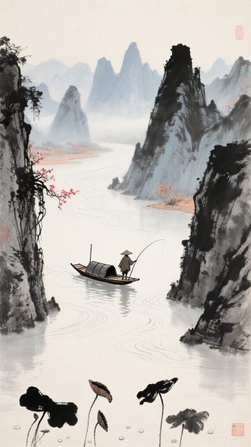 俯瞰视角,中国传统泼墨山水风格,浅米色宣纸底色上,以浓淡不一的墨色皴擦出层叠交错的喀斯特峰林,群峰如雨后春笋般从江面拔地而起,主峰以焦墨勾勒轮廓,次峰以淡墨晕染,远山则融入氤氲的灰蓝雾气中。画面中央是蜿蜒如银带的江面,以极细的飞白笔触表现流动的水波,一叶乌篷船正从两座对峙的山峰间缓缓驶出,船头渔翁身披蓑衣,斗笠遮住面容,仅露出持竿的剪影。左侧峭壁上垂挂着几缕墨色藤蔓,其间点缀着几点朱砂色的野山桃,与远处淡赭石色的山影形成微妙呼应。近景水面漂浮着三五片残荷,墨色荷叶以侧锋扫出,留白处形成晶莹的露珠。整体构图遵循"高远-深远-平远"三远法,大量留白营造出"江流天地外,山色有无中"的空灵意境,色调以墨色的浓淡变化为主,仅在细节处点缀赭石与朱砂,呈现出淡泊中蕴含生机的东方禅意。