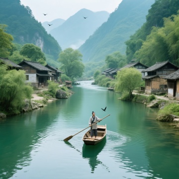 中国传统水墨风格的山水画,整体采用青绿色调,远山近峰以深浅不一的青绿渐变描绘,线条流畅柔和,勾勒出山峦的层叠起伏,山间云雾以淡青色渲染,朦胧缥缈,山脚下蜿蜒曲折的河流呈现出清澈的碧绿色,水面波光粼粼,两岸点缀着几株青绿色的树木,枝干挺拔,枝叶疏朗,天空中两只飞鸟剪影清晰,整体画面清雅宁静,充满东方禅意,构图遵循传统山水画的高远与深远结合,留白恰到好处,营造出悠远空灵的意境。
