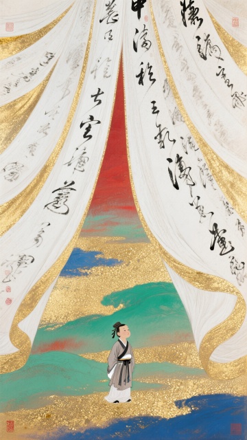 古典中式工笔水墨画,融入鎏金元素,展现山川河流的壮丽与细腻。