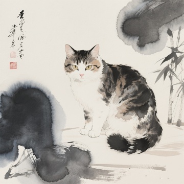 青绿山水长卷,以矿物颜料渲染的孔雀石绿与青金石蓝为主色调,画面中央斜出一株紫毫勾勒的湘妃竹,竹节以赭石晕染,竹叶尖梢泛出胭脂红,有的如火焰般上挑,有的似雨滴般下垂。背景以淡花青泼墨出层叠远山,云雾处用藤黄与钛白调和成朦胧烟霭,右下角留白处点缀三两只朱砂红蜻蜓。笔触兼工带写,竹枝挺拔处用铁线描,竹叶灵动处施破墨法,整体色调在青绿主调中见赭石点缀,于传统水墨意境中注入宝石般的色彩层次。