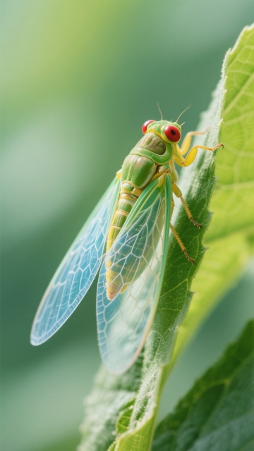 一只蝉趴在嫩绿的树叶上,蝉的翅膀上挂着晶莹的露水,背景为树叶旁边点缀着几朵鲜艳的小花,色彩柔和,与嫩绿的树叶形成鲜明对比。整体画面宁静清新,展现出夏日自然的美感与禅意。