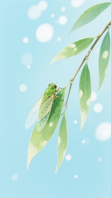 清新感工笔风,水彩渲染,蝉栖绿叶,露珠晶莹,花丛点缀,自然生动。