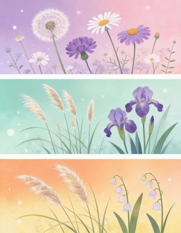 一套四张的系列插画,每张均为纯色背景,采用日式二次元风格的植物插画设计,线条流畅细腻,色彩渐变柔和,带有轻微的高光和阴影表现立体感。第一张:深绿色背景上的粉色樱花枝,五片粉色花瓣的樱花点缀在棕色枝干上,枝干有自然的分叉和细微的纹理,花瓣边缘有白色渐变高光;第二张:深蓝色背景上的紫色绣球花簇,圆形的绣球花由许多小花组成,花瓣呈水滴状,枝干上有细小的绿叶衬托,整体色彩饱和度适中;第三张:浅黄色背景上的红色枫叶枝,枫叶形状为掌状五裂,叶片边缘有锯齿,枝干上有几片飘落的枫叶动态,叶脉清晰可见;第四张:浅灰色背景上的白色梅花枝,梅花有五片花瓣,中心有黄色花蕊,枝干较为粗壮有节疤,枝头点缀几个含苞待放的花骨朵。四张插画规整排列,每张画面构图保持一致的枝干倾斜角度和疏密分布,整体风格统一,色彩搭配协调,形成完整的系列感。