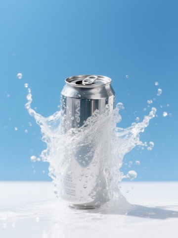 一瓶易拉罐气泡饮料产品特写,被包裹在一股泼溅的水中(从地面泼溅而起,激起水花,水花晶莹剔透,折射着光线),背景是蓝天