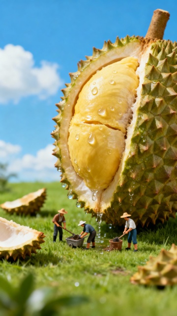 微缩艺术风,实景感与趣味感交融,3D重拟物手法呈现超现实主义场景,液态果浆滴落如雨,清新自然中隐喻丰收喜悦。