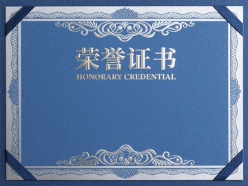 一张荣誉证书设计图,整体风格为正式、典雅的证书样式,主色调改为深蓝色与金色搭配,色彩和谐庄重。证书中央上方有金色立体浮雕效果的“荣誉证书”四个大字,下方为金色英文“HONORARY CREDENTIAL”及装饰性花纹线条。边框样式改为深蓝色卷草纹与金色回纹相结合的双层边框,外层为深蓝色连续卷草纹样,内层为金色精致回纹,边框线条细腻流畅,带有轻微的浮雕质感。证书背景为米白色带有细腻暗纹的纸张纹理,整体光影柔和,高光集中在文字和边框的浮雕部分,营造出高端、正式且具有权威性的氛围,视觉层级清晰,核心信息突出,符合荣誉证书庄重、正式的设计目的。