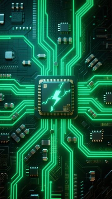 深蓝色背景上,以电路板纹理为基础,中央矗立着巨大的、立体发光的蓝色"AI"字母,字母内部有精细的电路纹路,周围环绕着流动的蓝色光效和闪烁的星点粒子,整体呈现出赛博朋克风格的科技感与未来感,具有强烈的视觉冲击力和深度感,营造出神秘而先进的氛围。