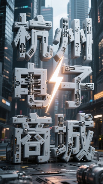 机械字体设计,“未来城市”,艺术字体,每个笔画由精致的机械零部件组式,颜色灰色,中间画上大闪电的形状,浮雕发光。背景未来城市,深景虚化。
