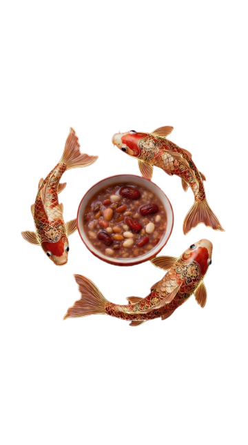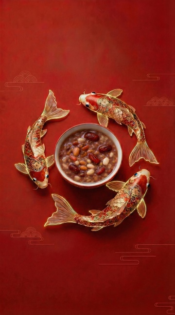 国潮风插画,卡通金鱼跃动吸金,鎏金文字与轻拟物金元宝点缀,红绿渐变背景营造喜庆中式氛围,寓意招财纳福。