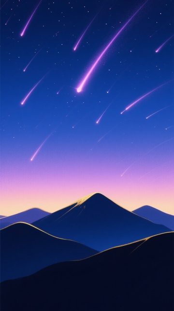极简风格插画,深邃夜空以渐变靛蓝为底色,点缀大量细长流星轨迹,流星呈现柔和的粉紫色光尾,下方是剪影风格的连绵山脉轮廓,山脉顶部勾勒出金色渐变的天际线,整体画面简洁干净,仅保留流星、夜空、山脉三个核心元素,色彩以靛蓝、粉紫、金色为主,视觉层次分明,营造宁静而梦幻的氛围。
