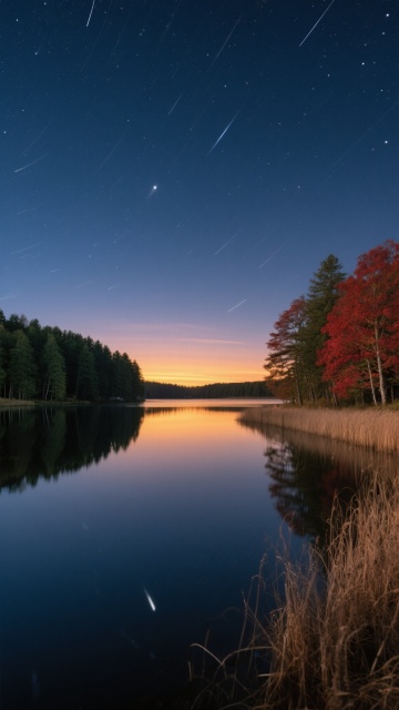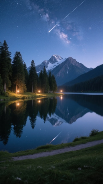 梦幻插画风,流星雨洒落山巅,虚拟现实中的浪漫唯美景致。