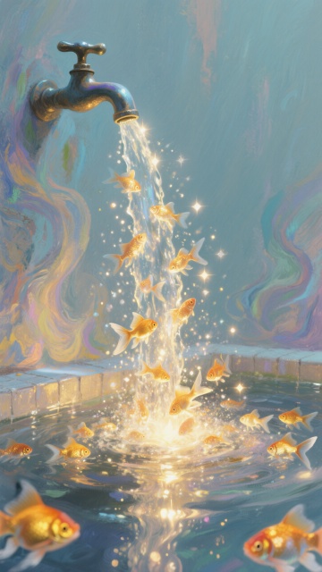 达利抽象画风,一个水池里的水龙头,水龙头中涌出成千上万只发光的金鱼,形成一道金鱼瀑布。魔法现实主义,奇幻风,体积光,高对比度,锐利对焦,纯色背景