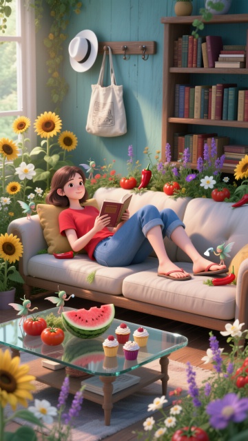 画面居中家具套组,手写艺术标题字体“自然好时光”,蓝天白云,开满各色的鲜花,草地,小溪,雪山,人物躺在沙发上,闭眼,赏景的,茶几上有餐布与食物,画面整体明亮清新,充满童话风格,阳光明媚