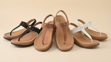 简约现代凉鞋,皮影风设计,清爽舒适,海滩实景感。