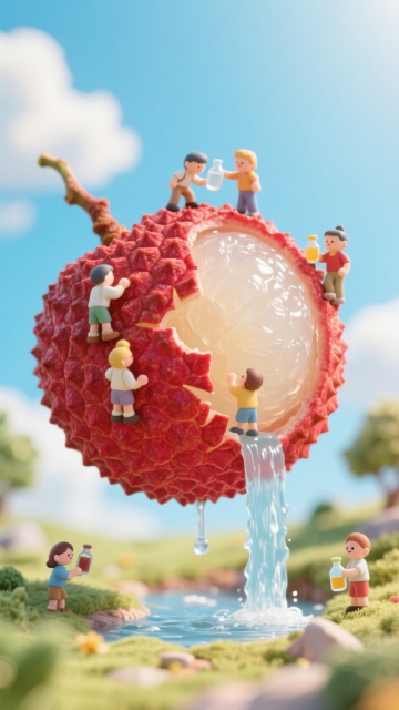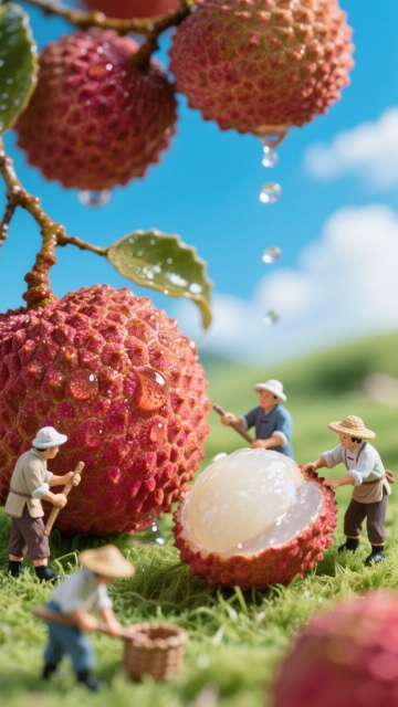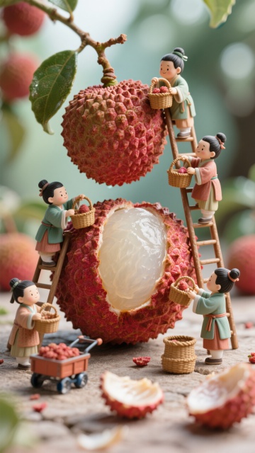 可爱卡通风格,微缩艺术展现中式清新感,童趣人物采摘荔枝,生动有趣。