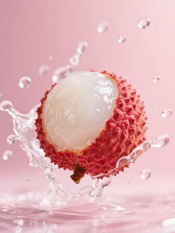 一张写实风格的荔枝摄影照片,画面中心是一颗被剥开一半的荔枝,露出晶莹剔透、饱满多汁的白色果肉,另一半红色带尖刺的果壳悬浮在下方,果肉与果壳之间有清澈的水花飞溅,水珠在空中形成优美的弧线和四散的水滴,整体构图富有动感和层次感,光线明亮,突出荔枝果肉的鲜嫩质感和水花的透明感,背景改为柔和的渐变粉色调,营造出清新甜美的氛围。
