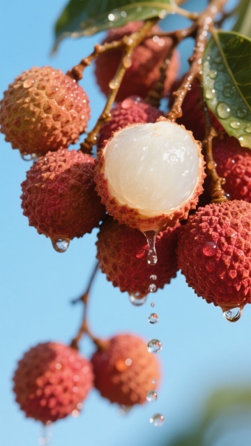 一串新鲜饱满的荔枝,果皮呈现鲜艳的红棕色,带有粗糙的颗粒质感,一颗荔枝被剥开,露出晶莹剔透、洁白如玉的果肉,荔枝果实和枝叶上挂着晶莹的水珠,水珠正从果实上滴落,形成清晰的水滴轨迹和悬浮的水珠,背景改为明亮的浅蓝色天空,带有柔和的自然光线,整体画面保持高清晰度和写实的摄影风格,光影效果突出,色彩鲜明,营造出清新自然的氛围。