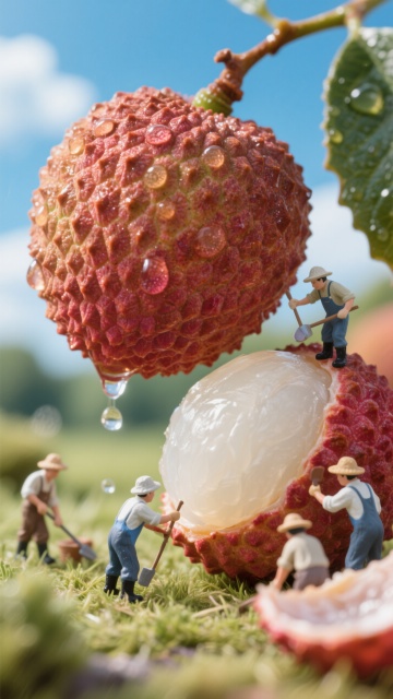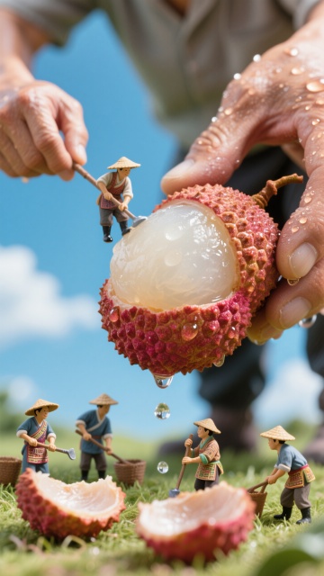 水彩风微缩艺术,小人耕作于巨大荔枝间,清新趣味,超现实主义风格。