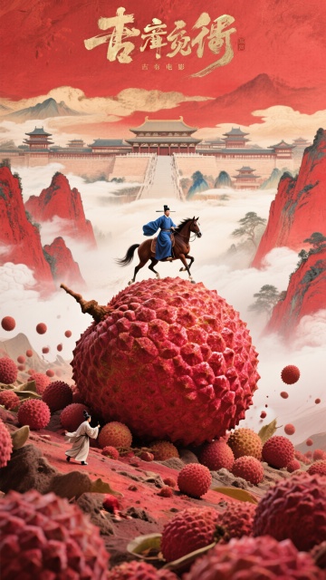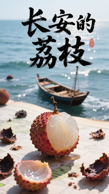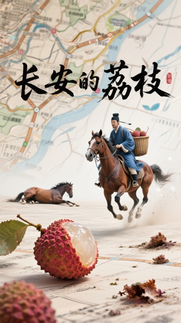画面标题是书法艺术字体“长安的荔枝”,一颗剥开的新鲜荔枝,背景是一副多条线路的古地图,地图上很小一辆马车、一匹倒下的马,船和散落的腐坏的荔枝,仰视角度