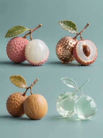 四个不同材质的荔枝系列素材集合,规整排布在纯色背景上,每个荔枝造型统一为两颗带枝叶的完整荔枝和一颗剥开露出白色果肉与棕色果核的荔枝组合,保持写实风格和水滴细节:第一个荔枝呈现光滑亮泽的陶瓷材质,整体色彩为淡雅的粉白色调;第二个荔枝为磨砂质感的金属材质,整体色彩为复古的铜金色调;第三个荔枝是细腻纹理的木质材质,整体色彩为温暖的棕黄色调;第四个荔枝为通透晶莹的玻璃材质,整体色彩为清新的淡绿色调,所有荔枝均有清晰的光影效果和立体感,画面信息传达清晰,视觉层级分明。