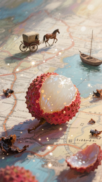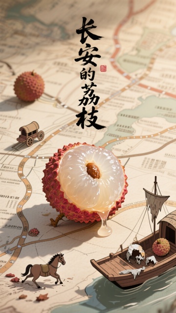 中式复古插画风,微缩艺术展现长安荔枝,水墨质感地图背景,创意融合古今。