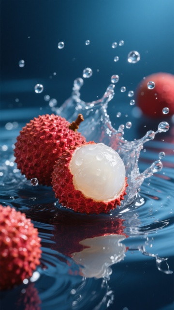 超写实摄影风格,几颗鲜红饱满、表面布满尖刺状凸起的荔枝,其中一颗被剥开,露出晶莹剔透、圆润光滑的白色果肉,果肉上带着细小的水珠,荔枝浸泡在清澈的水中,水面上溅起一道动态十足的水花,水花中包裹着无数透明的气泡,水珠和水花在深蓝色渐变背景下折射出冷调的光芒,水面波光粼粼,倒映着荔枝的影子,整体营造出一种清凉、静谧而又充满水润感的氛围,光线从侧面打来,在荔枝表面和水花上形成明显的高光和阴影,细节极致清晰,质感细腻,色彩以深蓝和荔枝的红白色为主,形成鲜明对比。