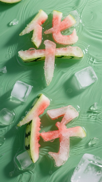 “美好一夏”字使西瓜材质,字体表面覆冰块和水质感的纹理,纯绿色背景