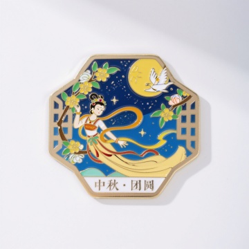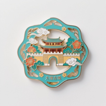 金属冰箱贴,中国风,杭州雷峰塔造型,塔周边桂花装饰,空中有二只小鸟,下方为西湖水景,背景为星空,珐琅彩渐变星云,金边外框带有3D浮雕