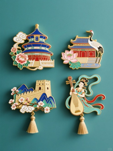 中国风扁平插画风格冰箱贴素材集合,6个不同配色与造型的规整排布设计,纯色背景,整体画面色彩变换,保留标志性建筑元素,每个冰箱贴以圆形或方形为基础轮廓,融入传统祥云、山峦、红日等装饰,采用平滑渐变色彩和简洁线条,呈现天坛、东方明珠、大雁塔等知名建筑的卡通化演绎,色彩明快和谐,具有浓厚的中国传统文化韵味与现代设计感,视觉层次清晰,信息传达高效,适合作为文创产品或家居装饰使用。
