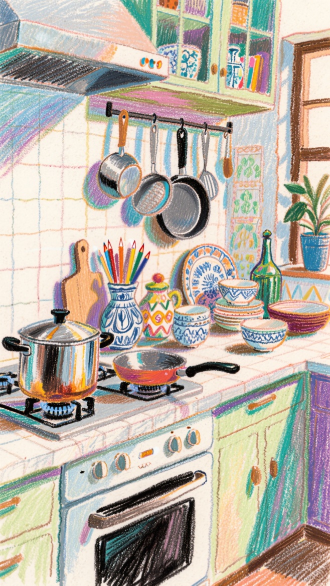 俯视角构图,在一个极简北欧风格的L型厨房转角,阳光从倾斜的天窗洒落形成菱形光斑,照亮深灰色哑光石英石台面。左侧悬挂式置物架上,三个手工陶瓷碗(灰蓝渐变釉面)叠放成螺旋状,旁边倒挂着两个黄铜咖啡杯和一把竹纤维餐布。右侧墙面安装着模块化磁吸刀架,整齐吸附着五把不同尺寸的日本旬刀,刀刃反射出冷冽的金属光泽。台面上,几何造型的白色珐琅锅旁散落着几颗带叶草莓,透明玻璃量杯里盛着琥珀色蜂蜜,旁边是一株垂吊的佛珠吊兰,藤蔓自然垂落在台角。开放式层板上,三个锥形玻璃瓶分别装着薰衣草干花、燕麦片和彩色藜麦,右侧迷你陶瓷花盆里的罗勒正舒展着心形叶片。地面浅灰色六边形瓷砖与墙面白色文化石形成材质对比,角落的橄榄绿垃圾桶与黄铜水龙头形成低调的色彩呼应,整体空间通过非对称平衡营造出有序的生活韵律感。