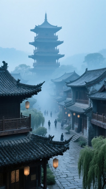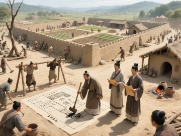 中式古典场景,3D重拟物风呈现古代城建实景,水墨与岩彩元素融合,人物服饰考究,展现先民筑城劳作的生动画面。