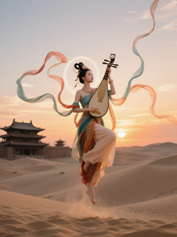 人物穿上敦煌舞者飞天造型衣服与发型,手拿琵琶在沙漠里,丝带环绕悬空仙气飘飘,背景是大沙漠,落日晚霞,远处的古风建筑,复古敦煌滤镜
